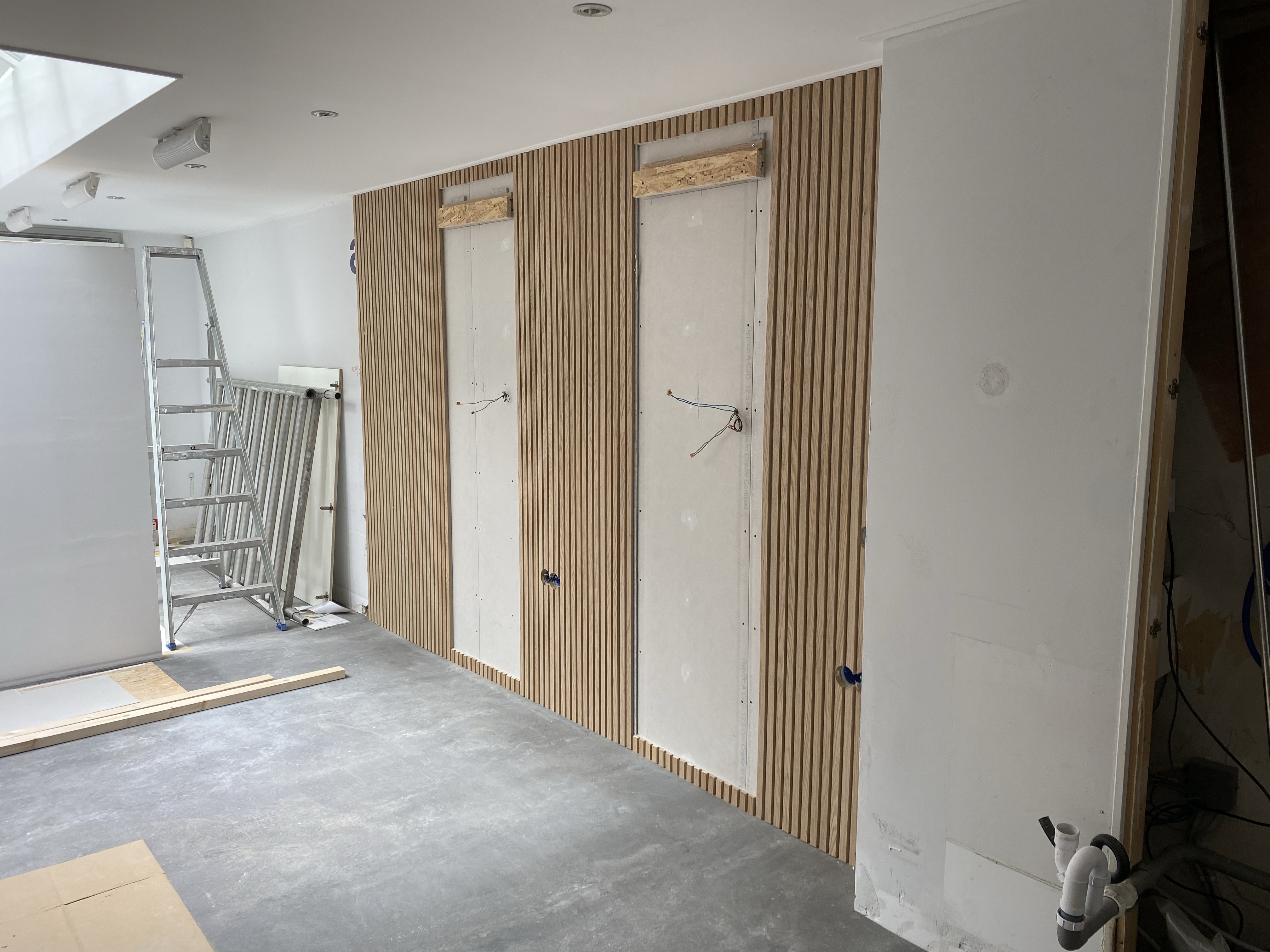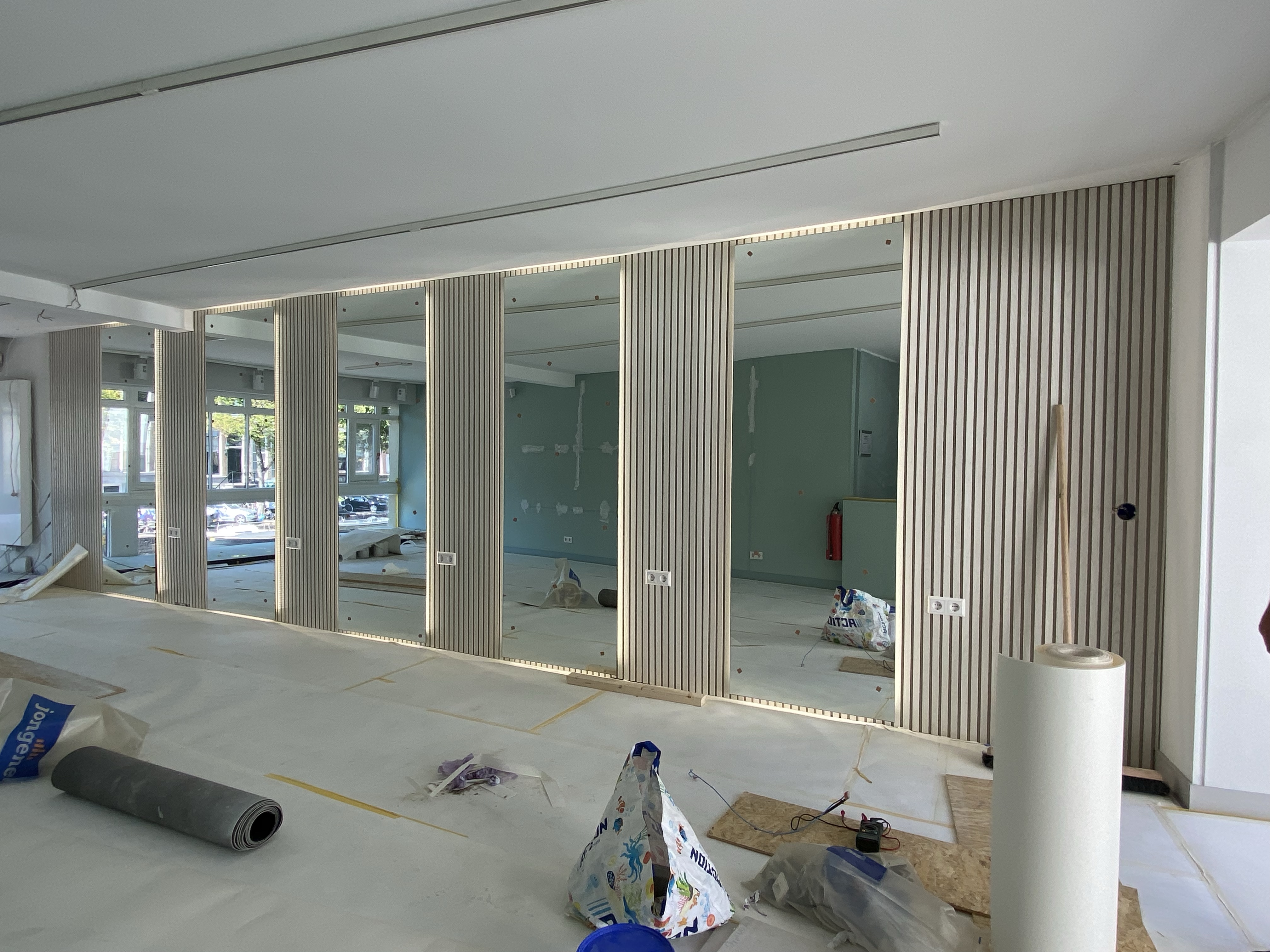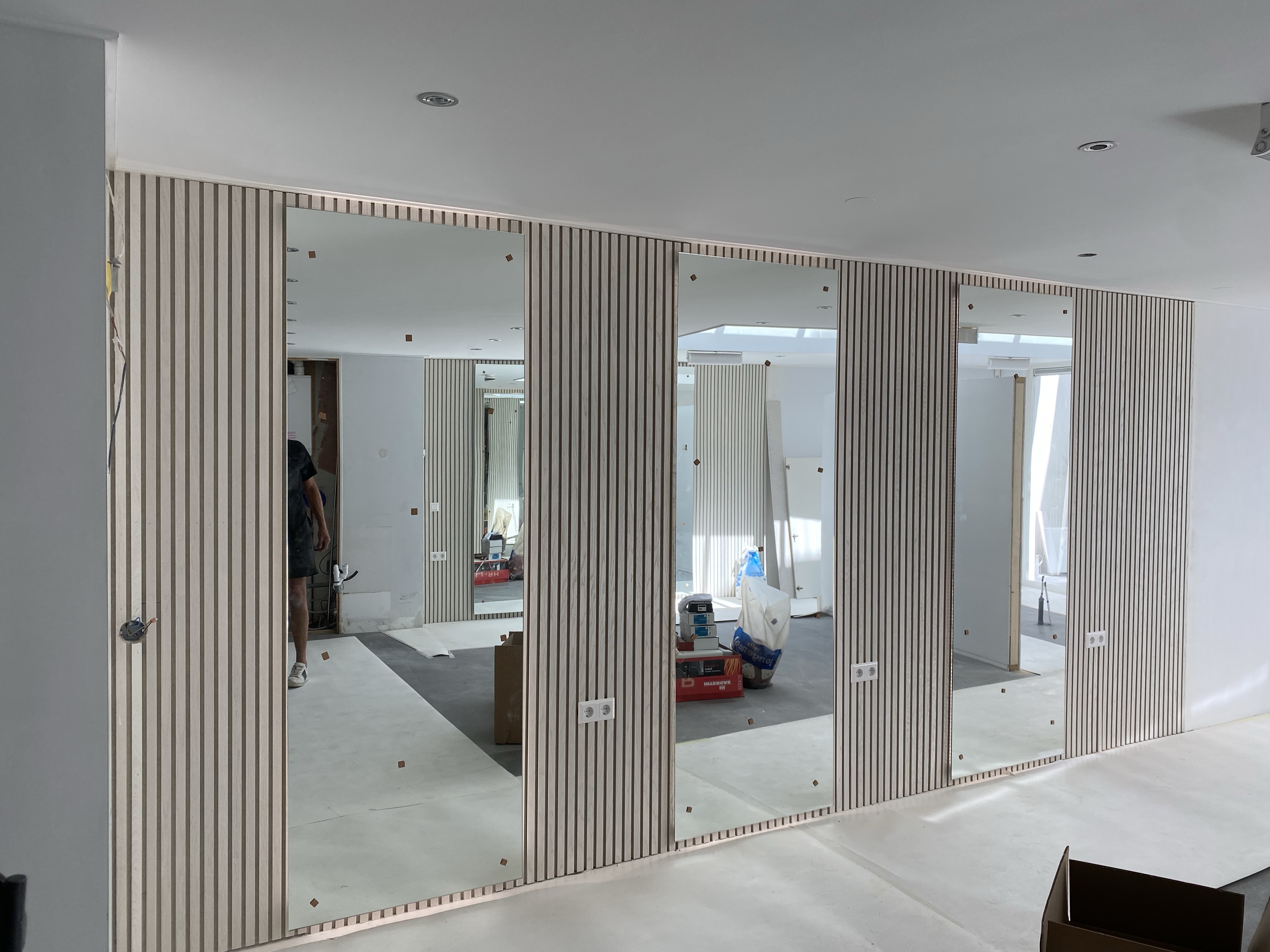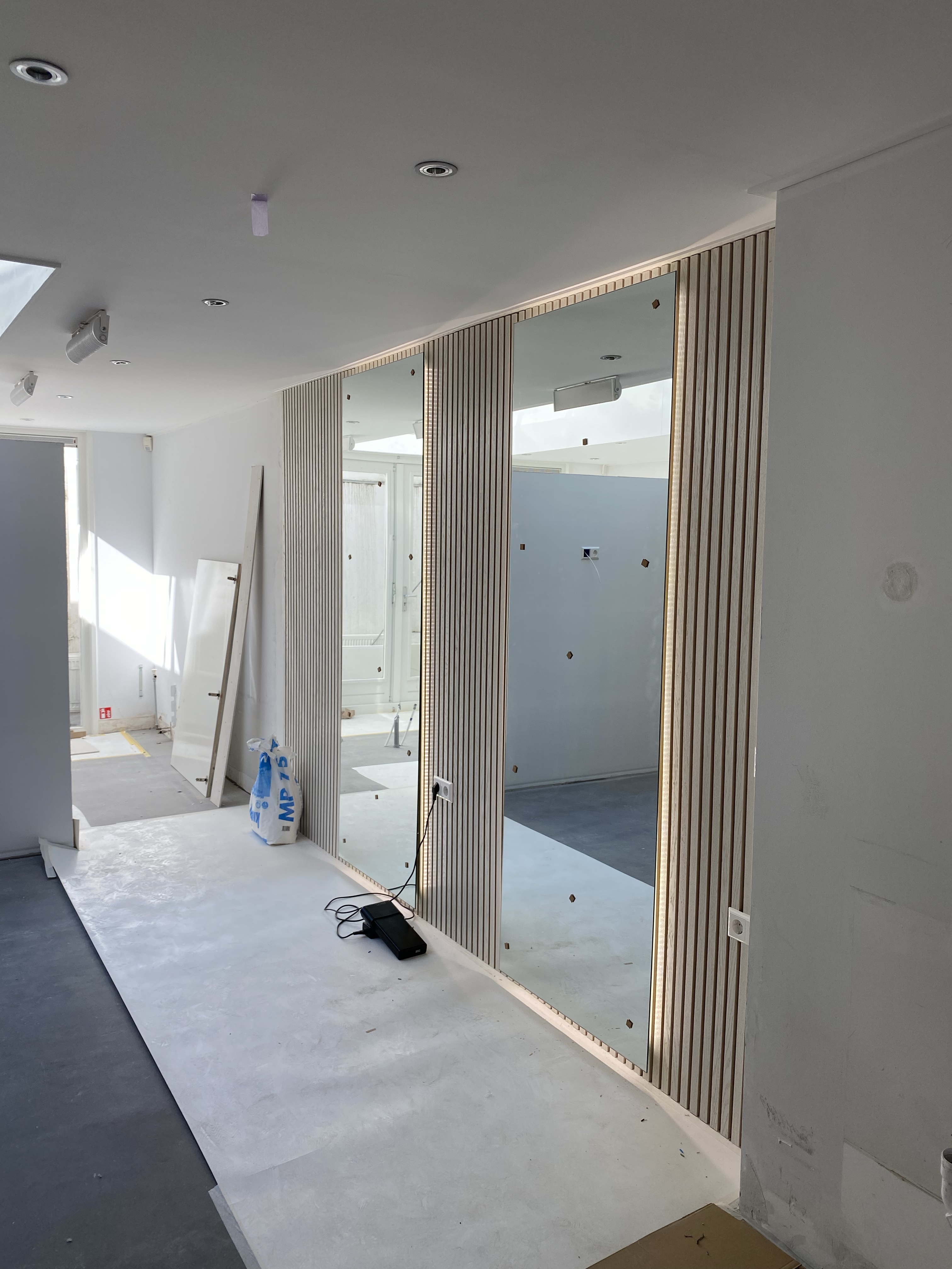 Hier heb ik een nieuwe ketel opgehangen, houten latten op de muren bevestigd rondom de spiegels, de latten laten spuiten, de spiegels weer aangesloten en opgehangen, lichtrails weer opgehangen en de plafonds zijn gesausd.