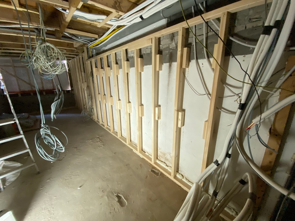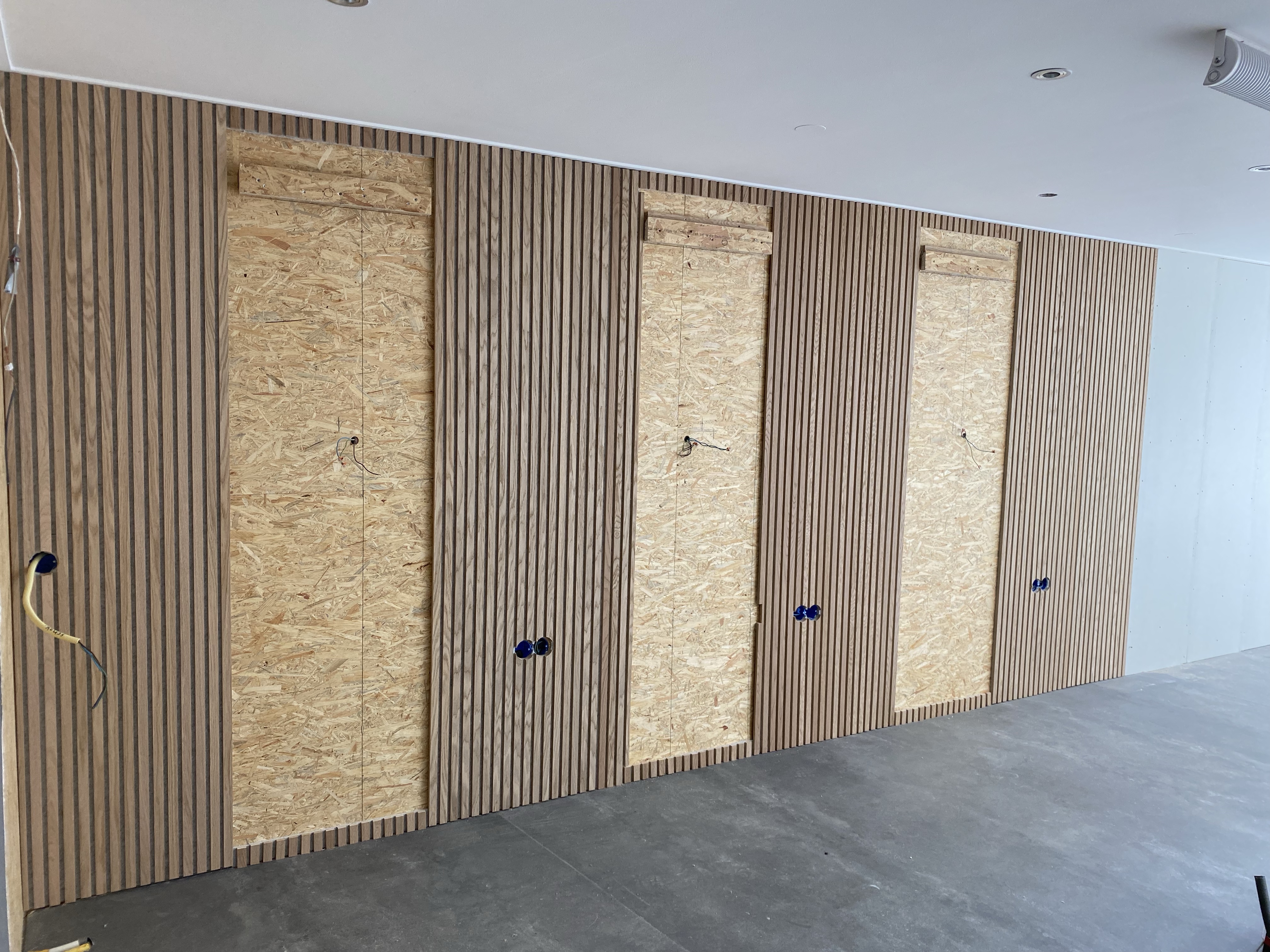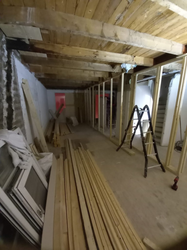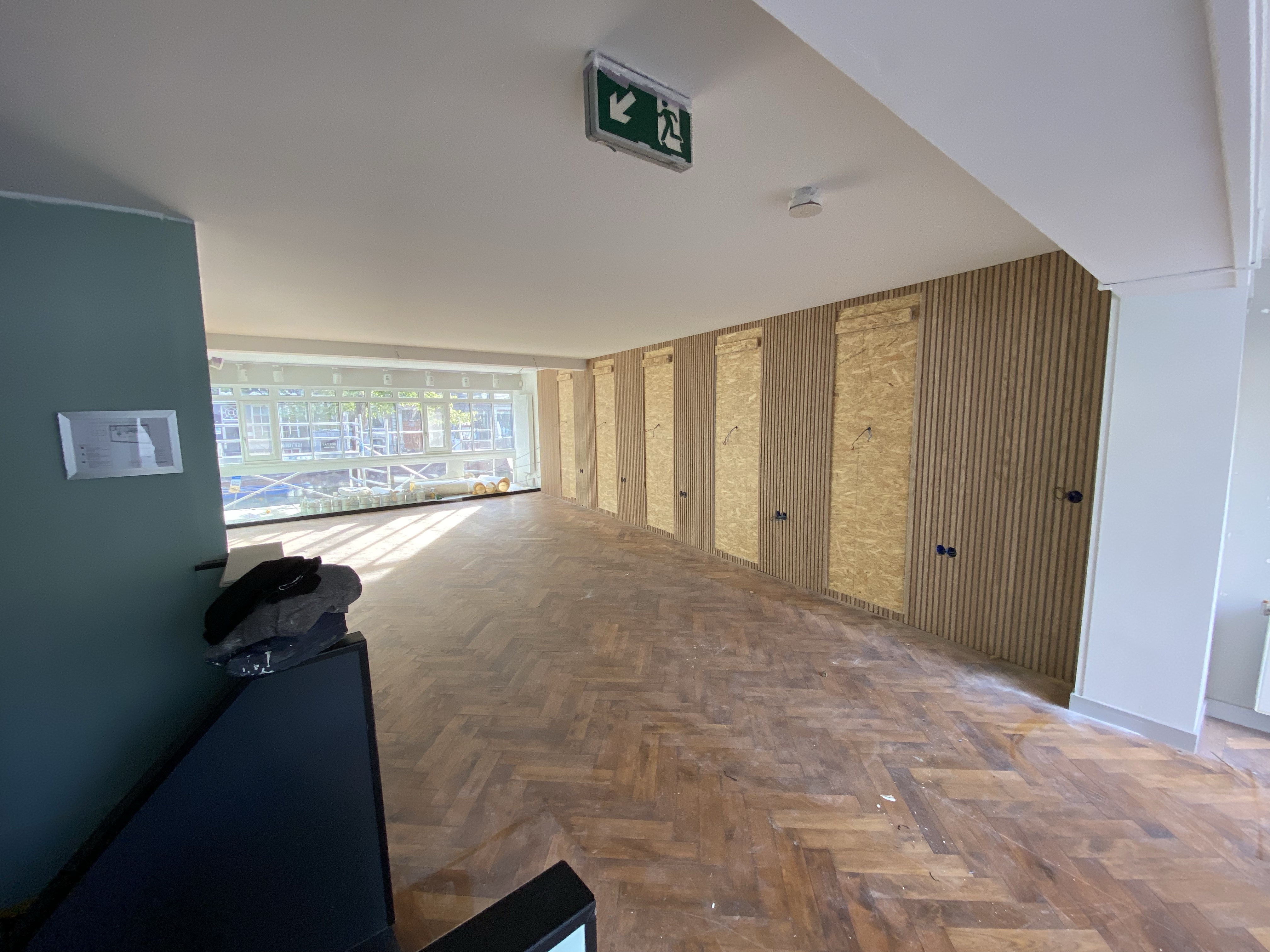 Hier heb ik een nieuwe ketel opgehangen, houten latten op de muren bevestigd rondom de spiegels, de latten laten spuiten, de spiegels weer aangesloten en opgehangen, lichtrails weer opgehangen en de plafonds zijn gesausd.