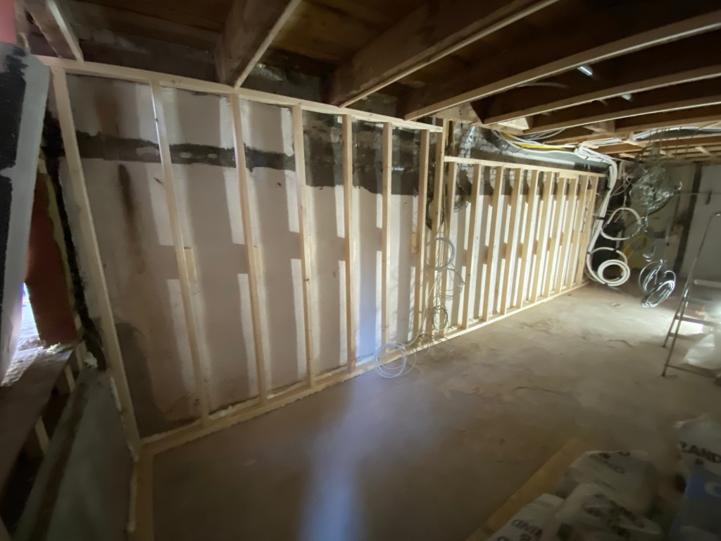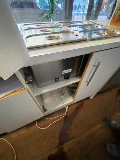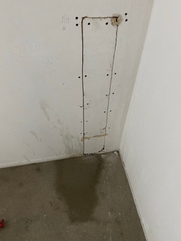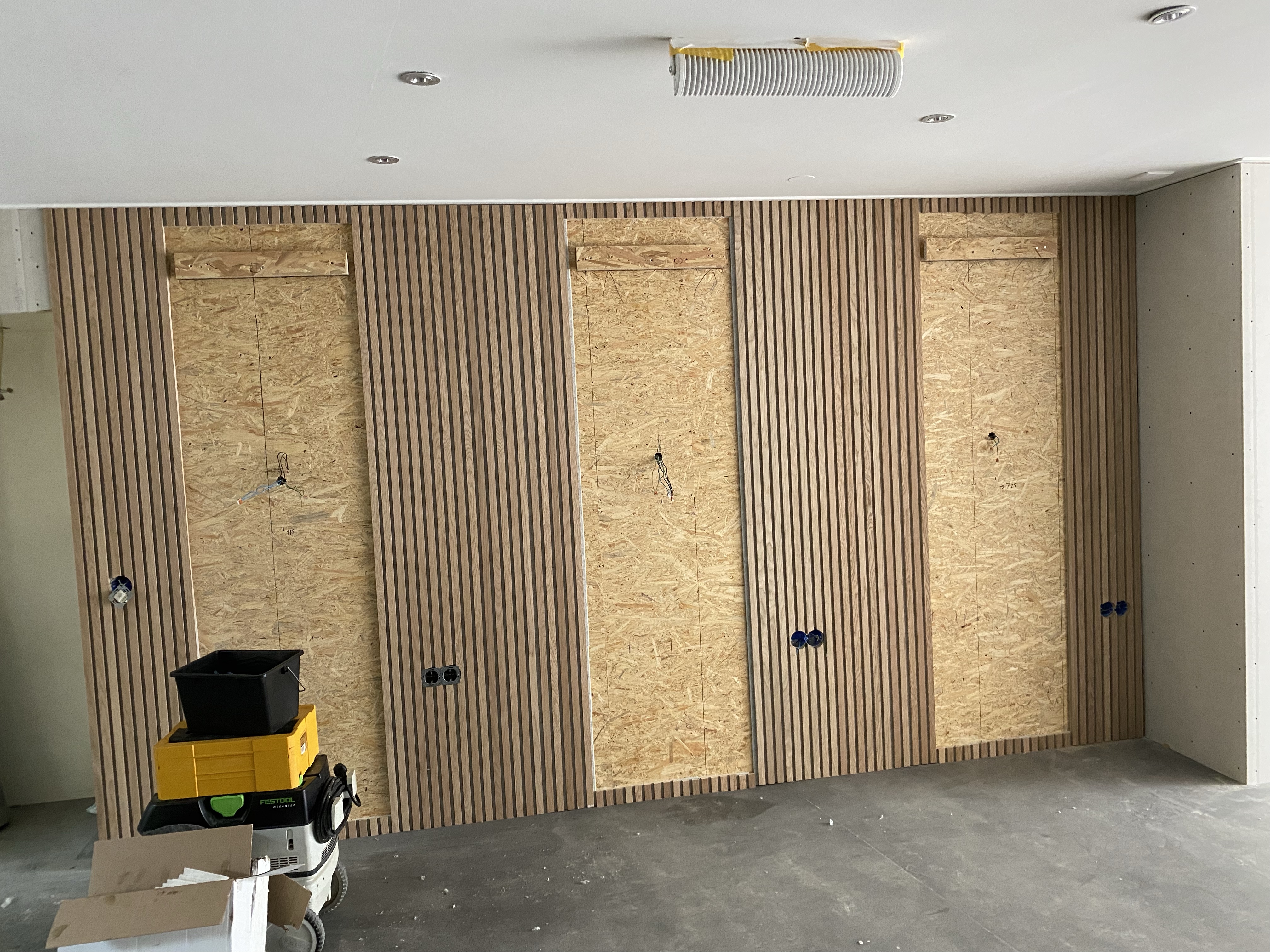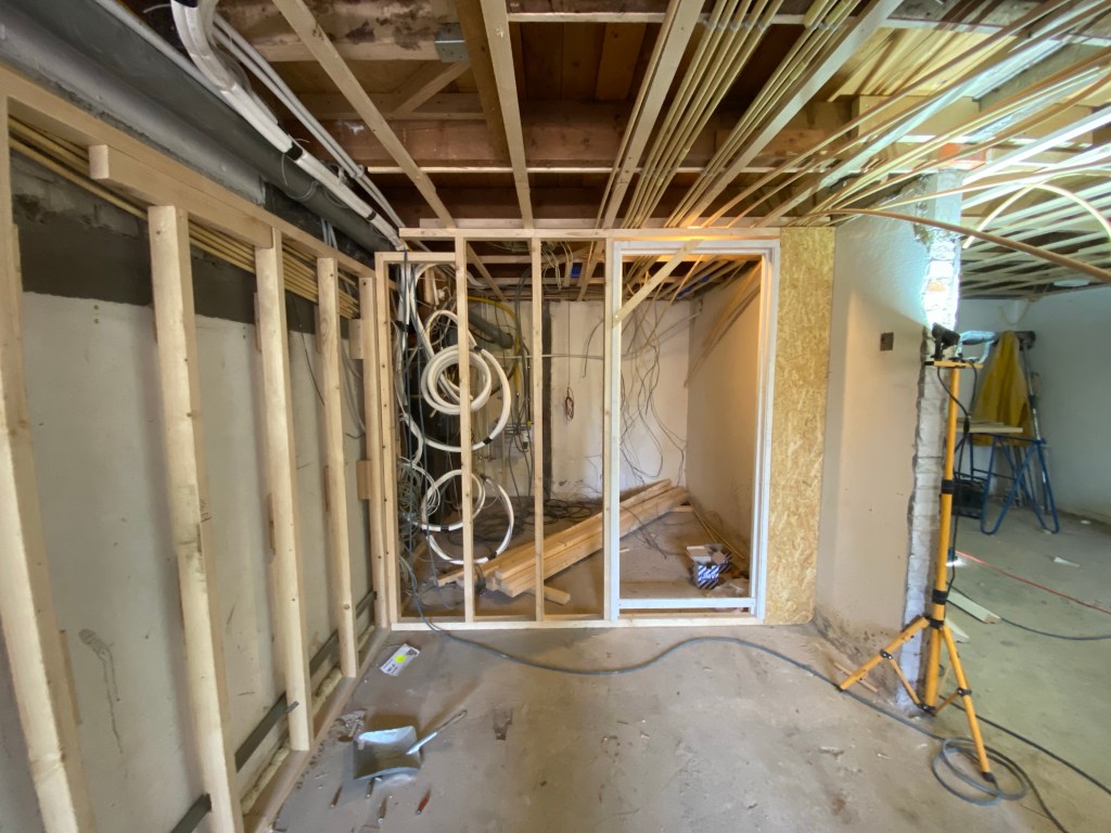 Hier heb ik een nieuwe ketel opgehangen, houten latten op de muren bevestigd rondom de spiegels, de latten laten spuiten, de spiegels weer aangesloten en opgehangen, lichtrails weer opgehangen en de plafonds zijn gesausd.