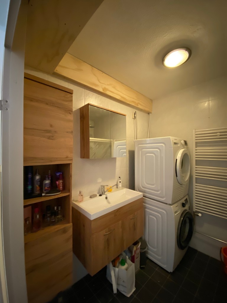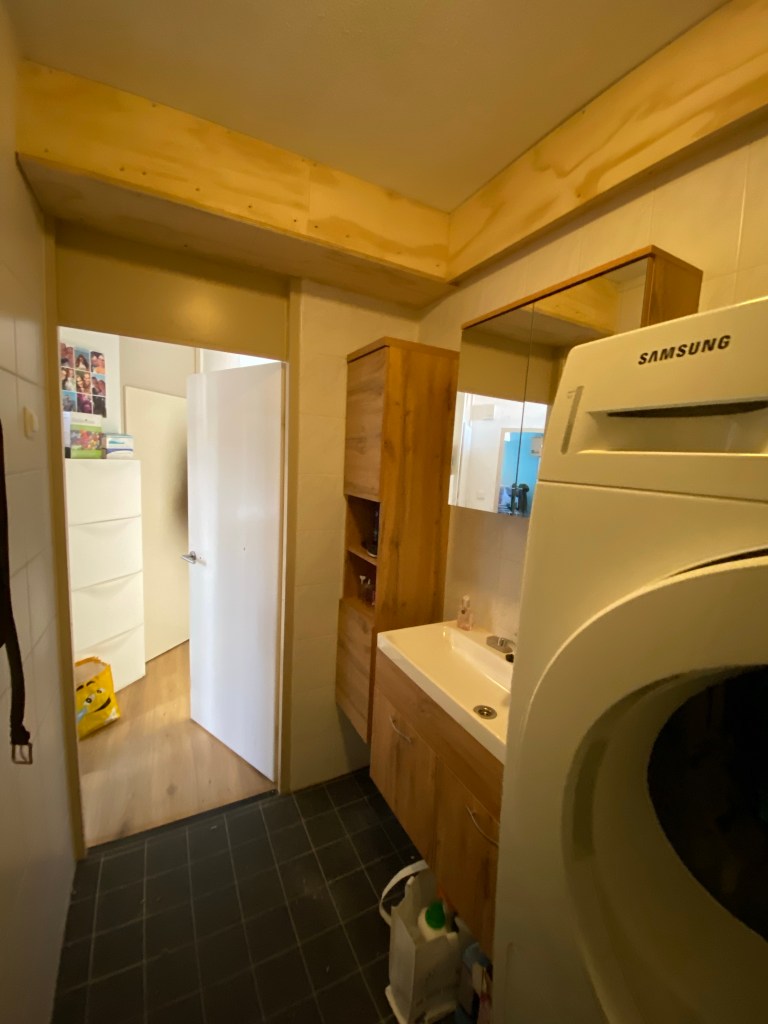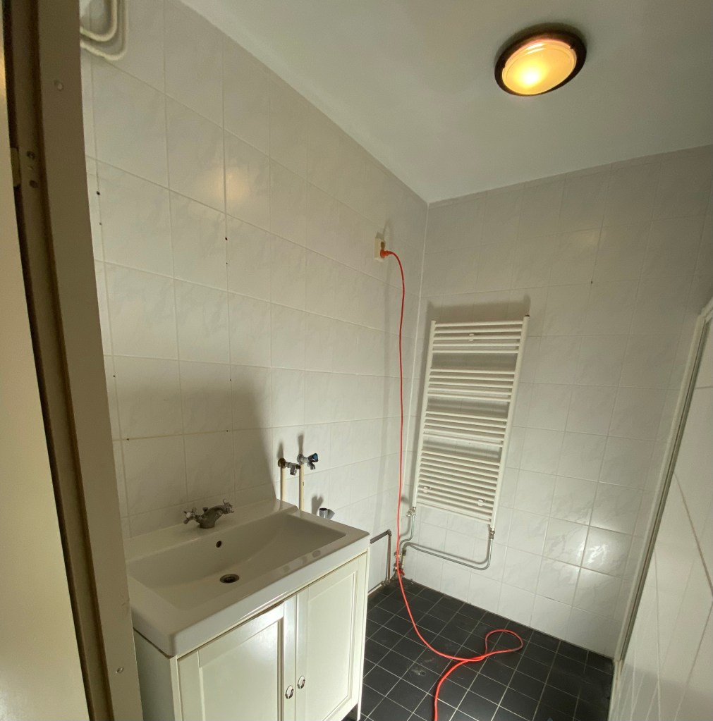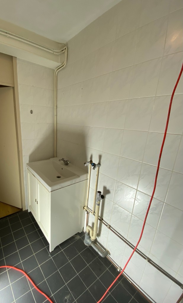 Hier heb ik de radiator verplaatst, divers leidingwerk omgelegd, de afvoeren omgelegd en de wastafel, spiegelkast en hoge kast geplaatst.