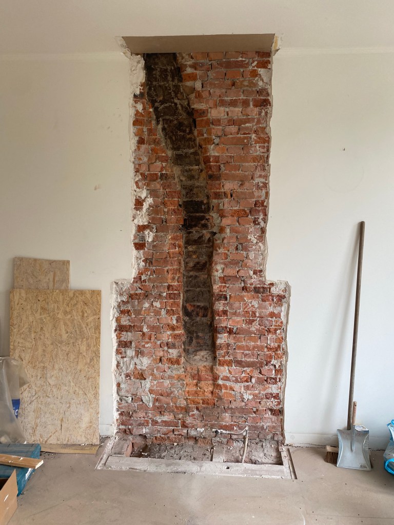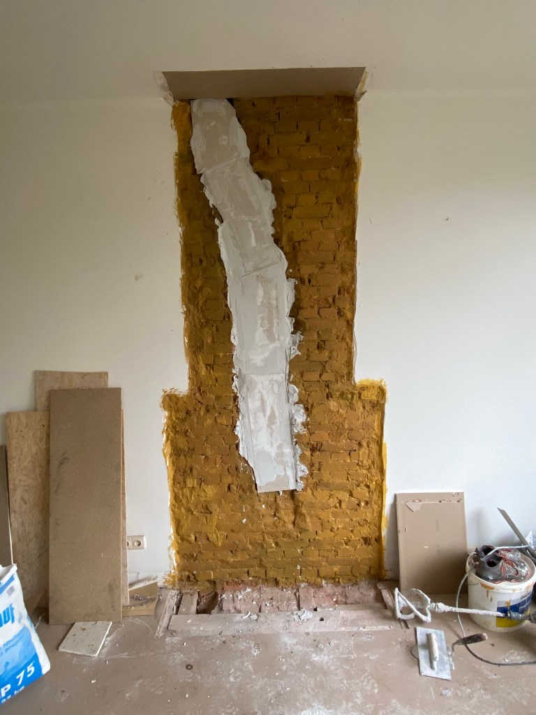 Hier heb ik de schoorsteen weggesloopt en voorbereid voor de stukadoor, een stuk wand bij de keuken weggesloopt t.b.v. de nieuwe keuken, het plafond open gemaakt t.b.v. de stalen balk en de convectorput dicht gezet.