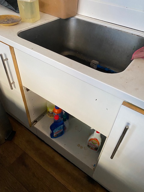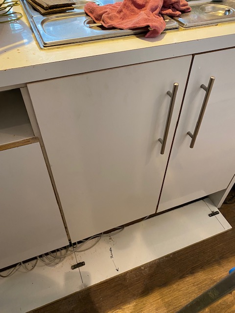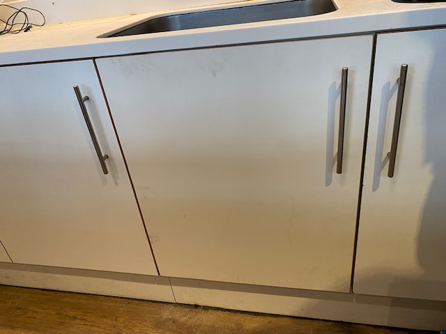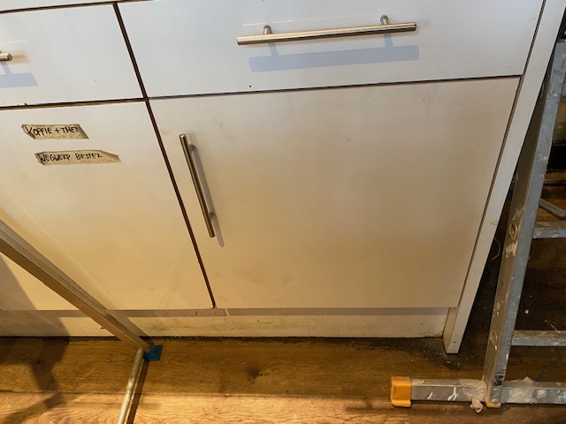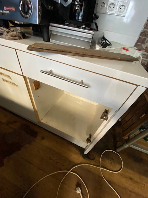 Hier heb ik voor de missende keukenkastdeurtjes nieuwe deuren gezaagd en geplaatst.